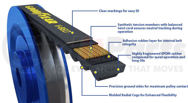 Restore your belt drive system to optimum levels with the Goodyear accessory drive belt. Each belt is developed to meet or exceed OE requirements for longer life and quieter operation.