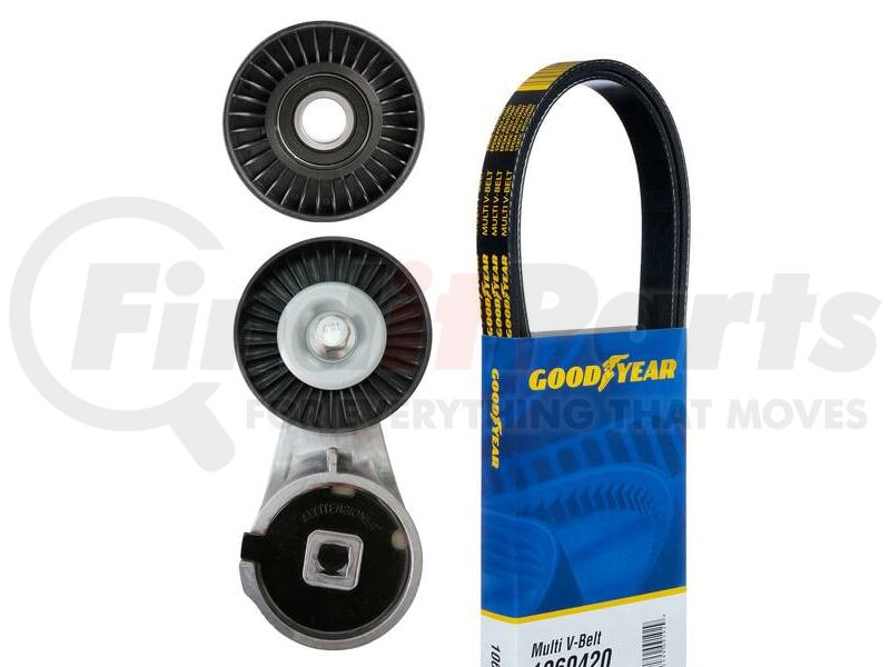 The Goodyear serpentine belt drive component kit provides a time-saving, convenient way to restore the serpentine belt drive systems on heavy duty vehicles. Each kit includes a serpentine belt, tensioner, and pulleys.